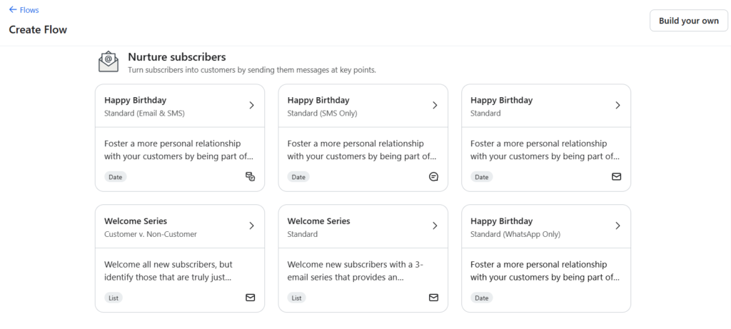 Once my contacts were imported, Klaviyo guided me toward setting up my first flow (their name for automations). You can quickly choose from popular options such as: